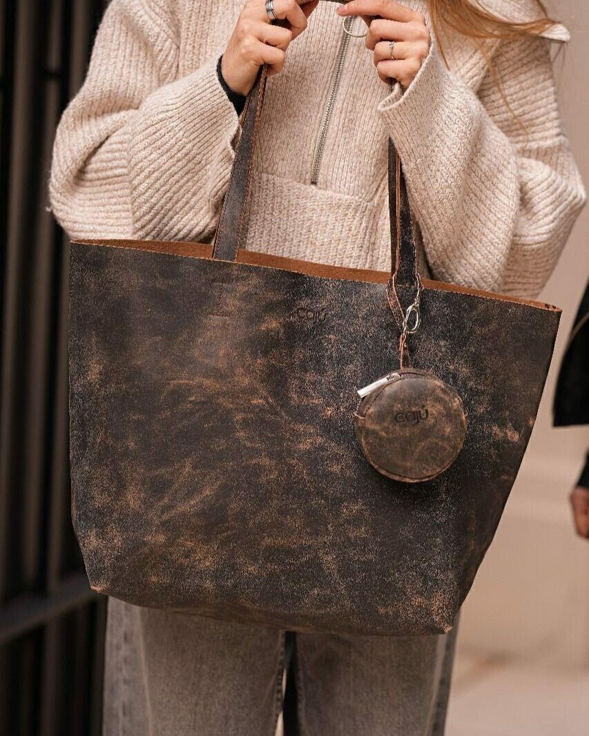 Confeccionada en cuero 100% de excelente calidad, con el logo Cajú grabado a tono. Su amplio tamaño la hace ideal para el día a día o para llevar todo lo que necesitás con estilo.
