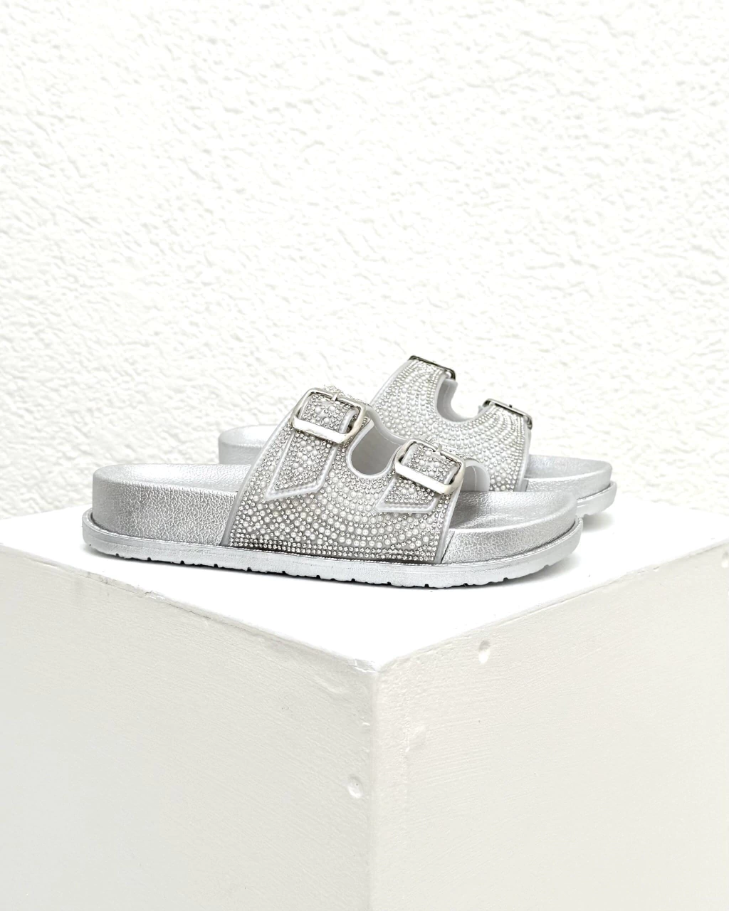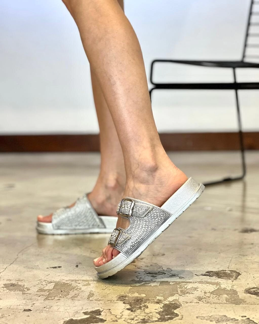 Zueco Kona con diseño moderno y brillante, confeccionado en material vegano de alta calidad. Presenta doble hebilla ajustable decorada con brillos y apliques, que aportan un toque glam a cualquier look. Su base ergonómica ofrece 3 cm de altura en la parte delantera y 2 cm en la trasera, brindando una pisada cómoda y estable.