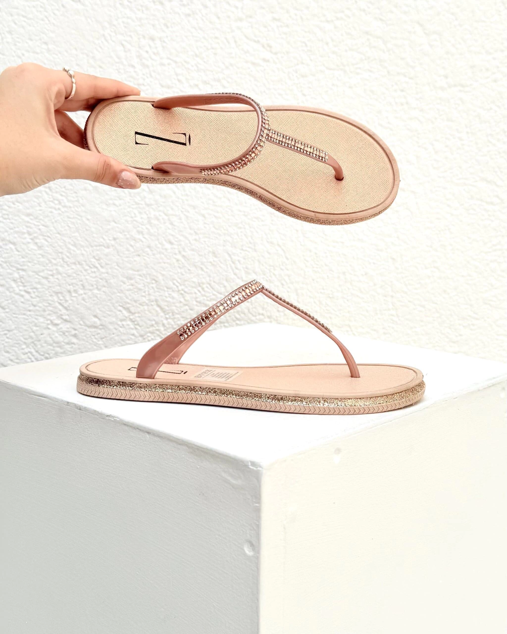 Zueco Mana, confeccionada en material vegano de excelente calidad, con un diseño elegante y delicado. Presenta tira fina en formato “V” decorada con brillos, que aporta un toque sofisticado y femenino. Su base cómoda de 1.5 cm de altura ofrece una leve elevación, ideal para el uso diario, manteniendo la ligereza y confort característicos del modelo.